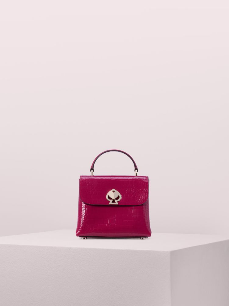you might recognize this vibrant mini top-handle satchel from our fall 2019 runway show. romy is hard to miss when its soft, shiny croc-embossed italian leather catches the light. inside, you'll find a buttery-soft faux microsuede lining and a triple-compartment construction for ultimate organization. an optional (and elegant) chain strap allows you to sling it over your shoulder when you need a free hand for your pumpkin latte. and don't worry about setting it down--the tiny feet will keep it beautiful for years to come. our spade heart twistlock doubles as clever décor and a very pretty closure.