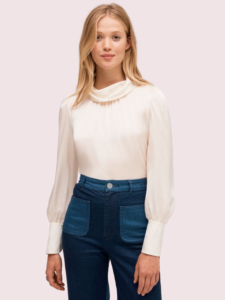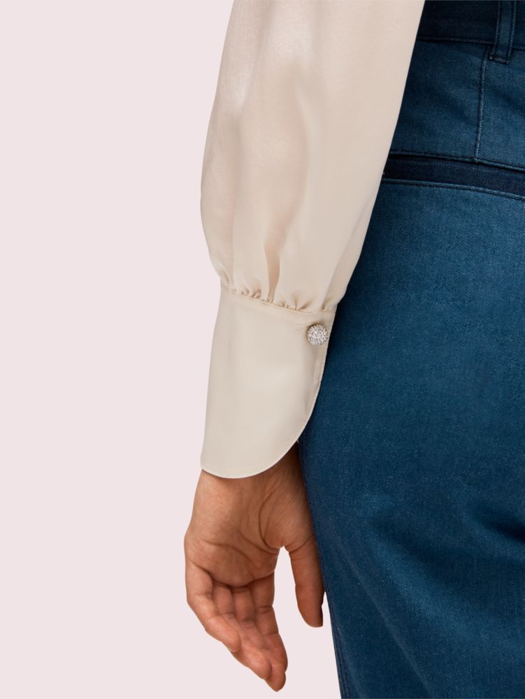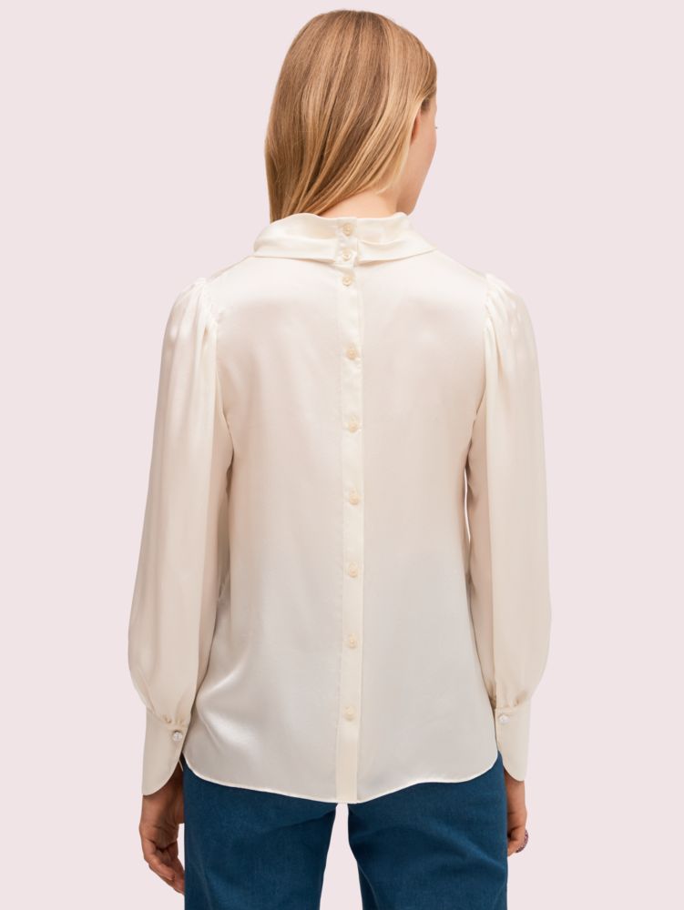 this polished blouse is a true closet staple. we blended feminine and masculine elements with a draped neck, button-down back and pavé-button barrel cuffs. and the luxe silk charmeuse is as soft as it looks.