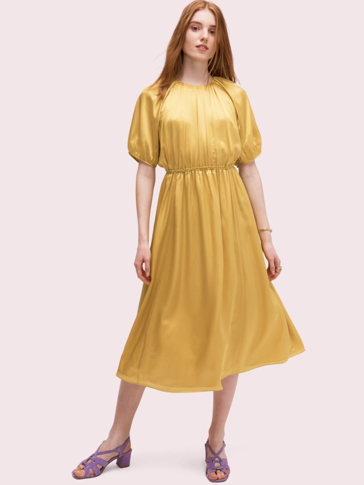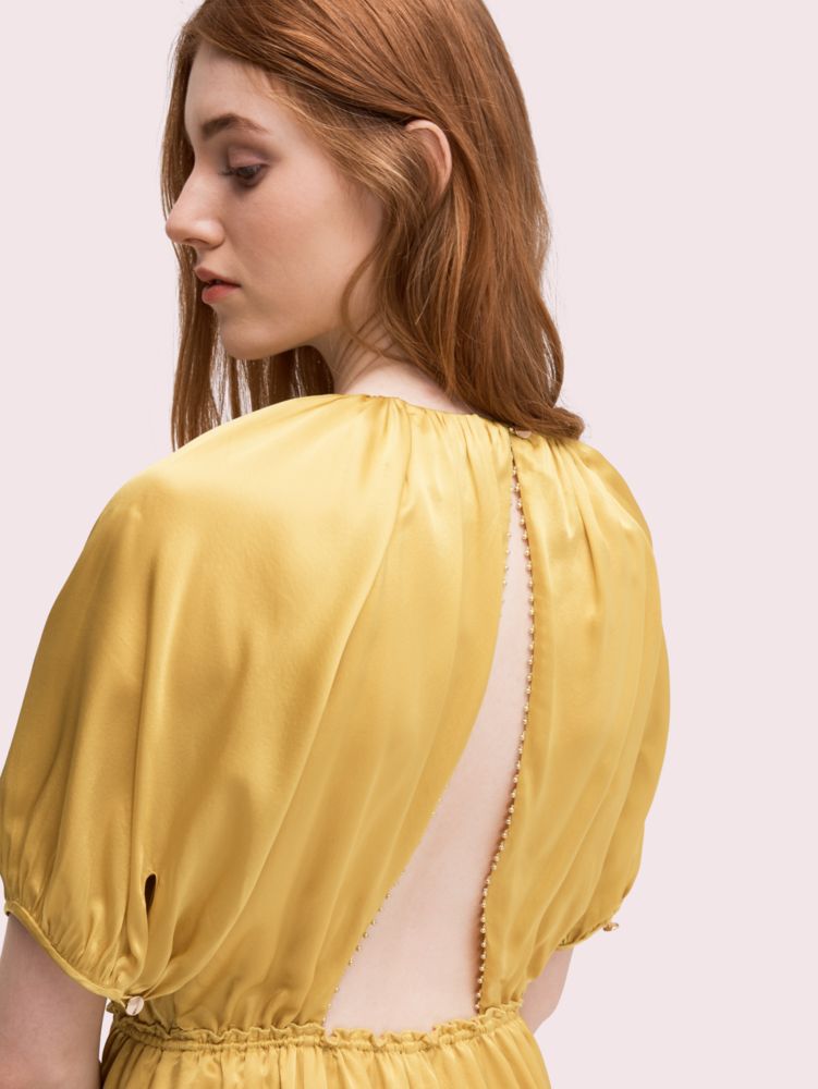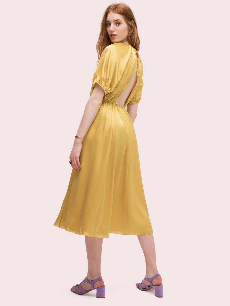 we think solid dresses can be just as dramatic as printed ones. a prime example is this midi dress, which we crafted of luxurious silk charmeuse. the slight puff sleeves and triangle open-back detail give it a feminine, seductive side. and last but not least, we added an elasticized waistband for a cinched look without the discomfort.