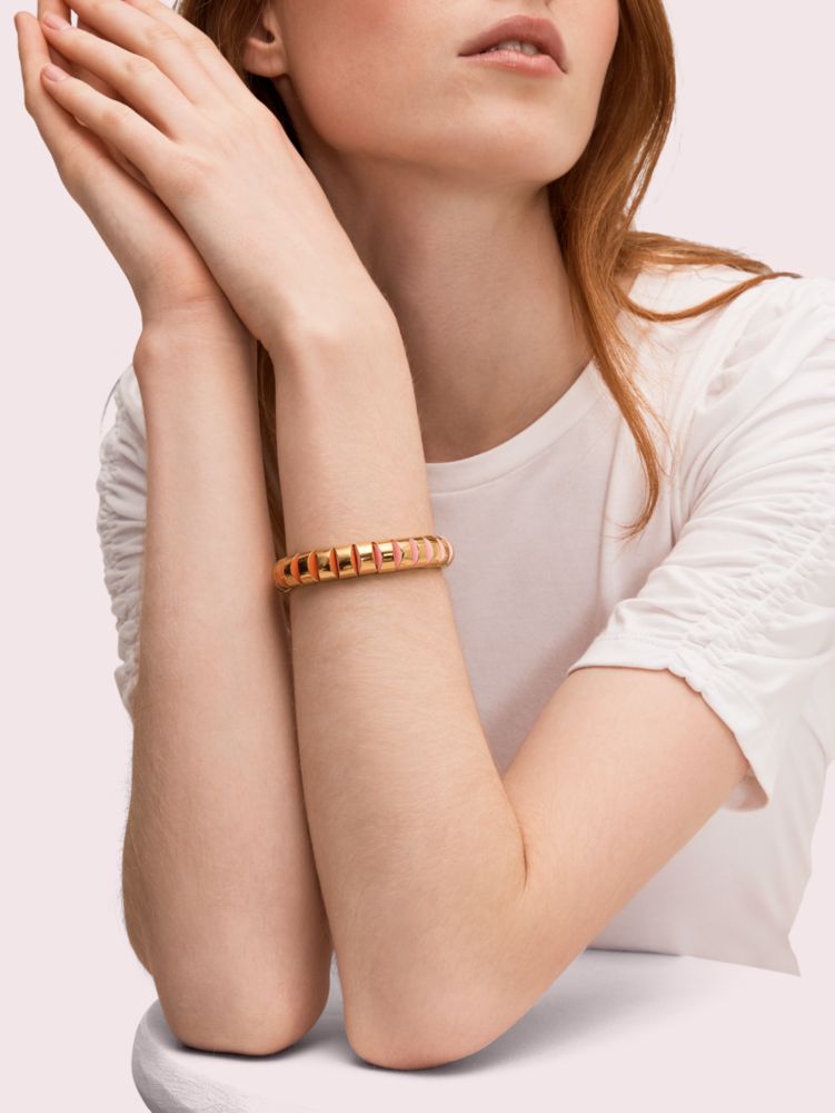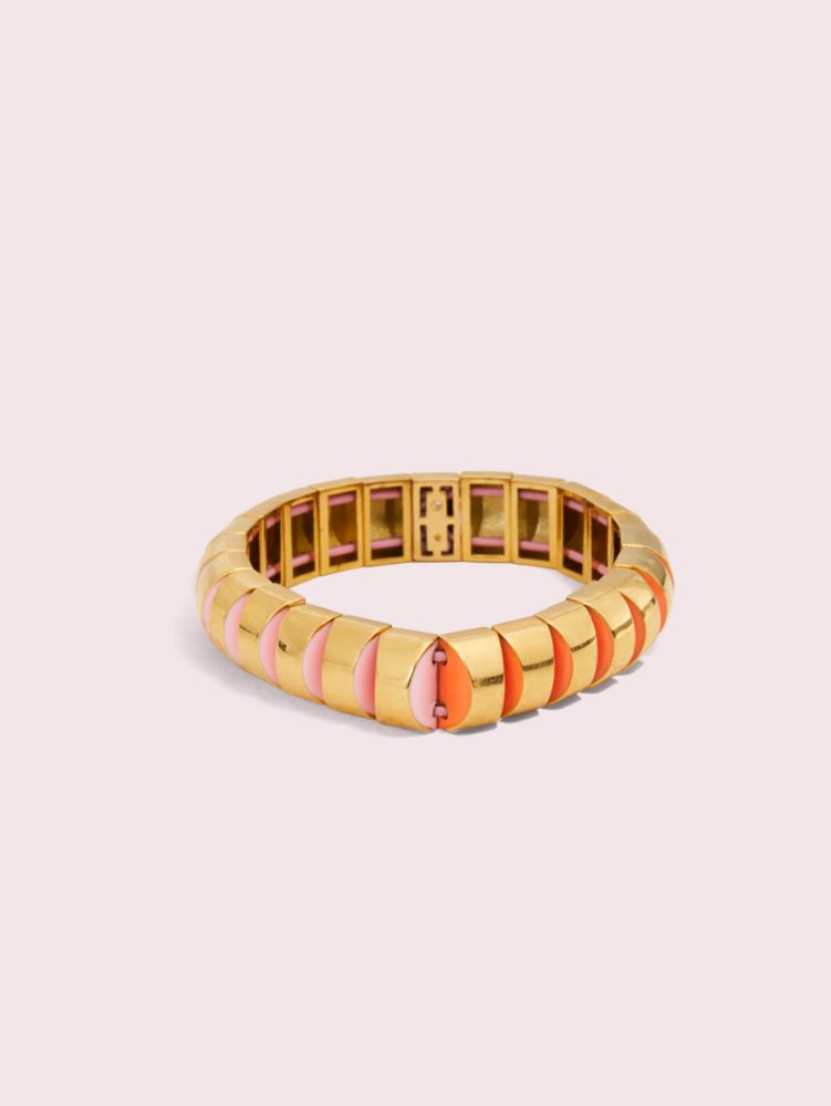 the links on this bracelet are a subtle nod to one of our favorite classic shapes: the scallop. we detailed the sides with pretty pops of pastel. another important thing you should know: this style is stretchy, which makes it really easy to slip on and go in a rush.