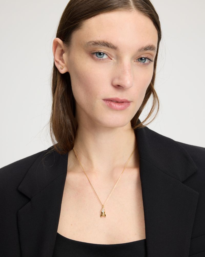Showcasing a crystal-embellished rocket, this mini pendant is out of this world.
