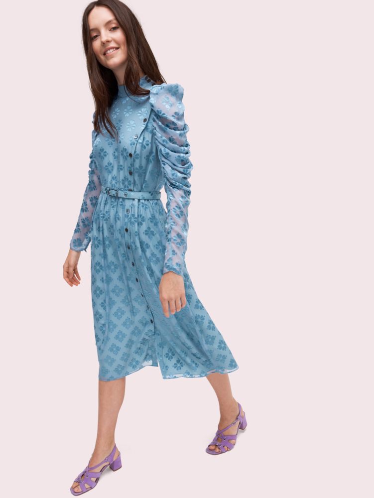 there are so many lovely details on this devore dress that walked the runway at our spring 2019 fashion show. first of all, its decorated with our spade flower print which we made by joining four spades together like leaves of a clover. then, theres the draped neckline and the puffed sleeves that gently cascade down your arms. and finally, the little buttons along the side add to the overall charm. we love how it looks paired with our lavender boots.