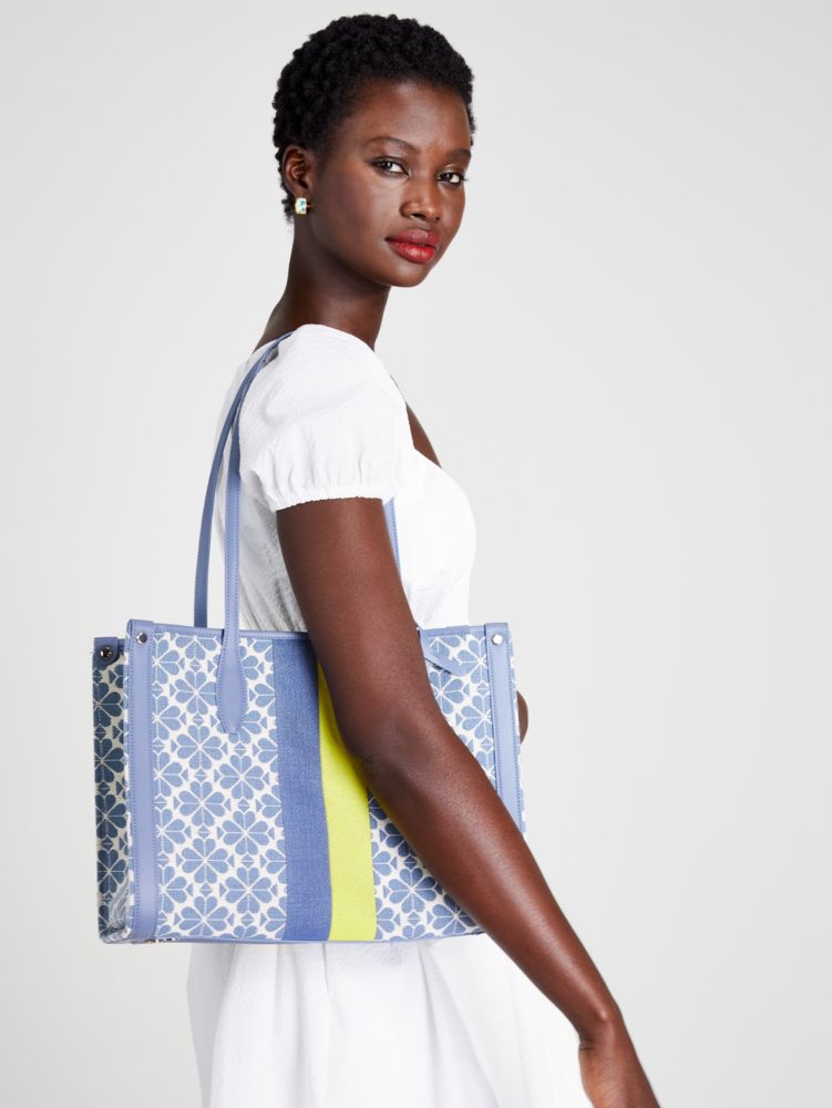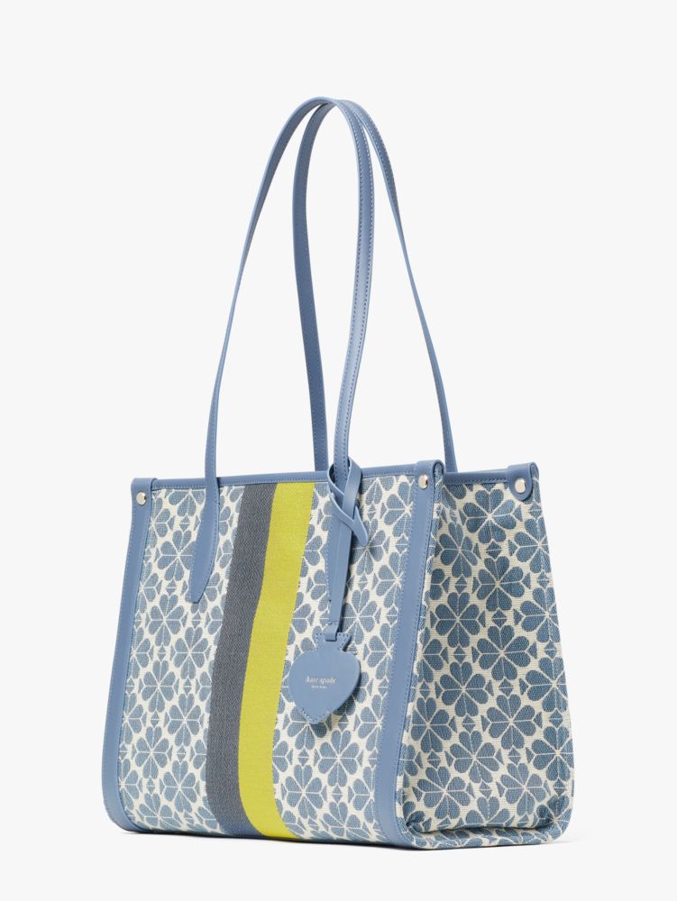 Kate Spade,Spade Flower Jacquard Stripe Market Medium Tote,Nylon,Leather,Tote,Stripe,Piping,Logo,Gusset,Gold Metal,Casual,