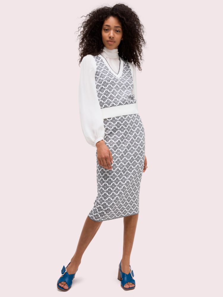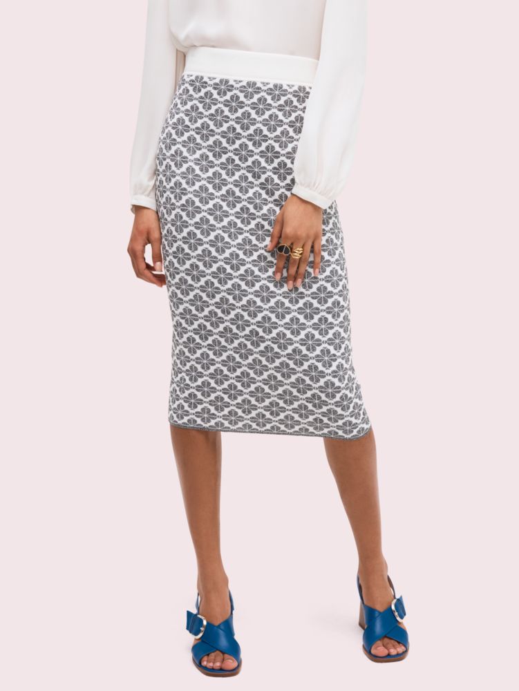 from far away the flowers look like a diamond pattern, but if you look closer, they're actually spades. youll see this new print on many pieces this season. we made it by combining four spades together, like the leaves of a clover. we love how chic it looks on this easy pencil skirt. we added a touch of sparkly yarn to give it a bit of shine too. its professional and playful at the same time.