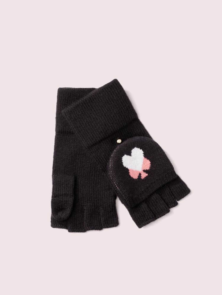 showcasing a graphic spade heart pattern, these pop top gloves are crafted of a soft (and cozy) stockinette stitch. wear them as mittens and button back the tops when you need free fingers for texting.