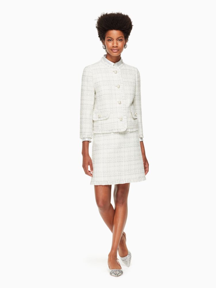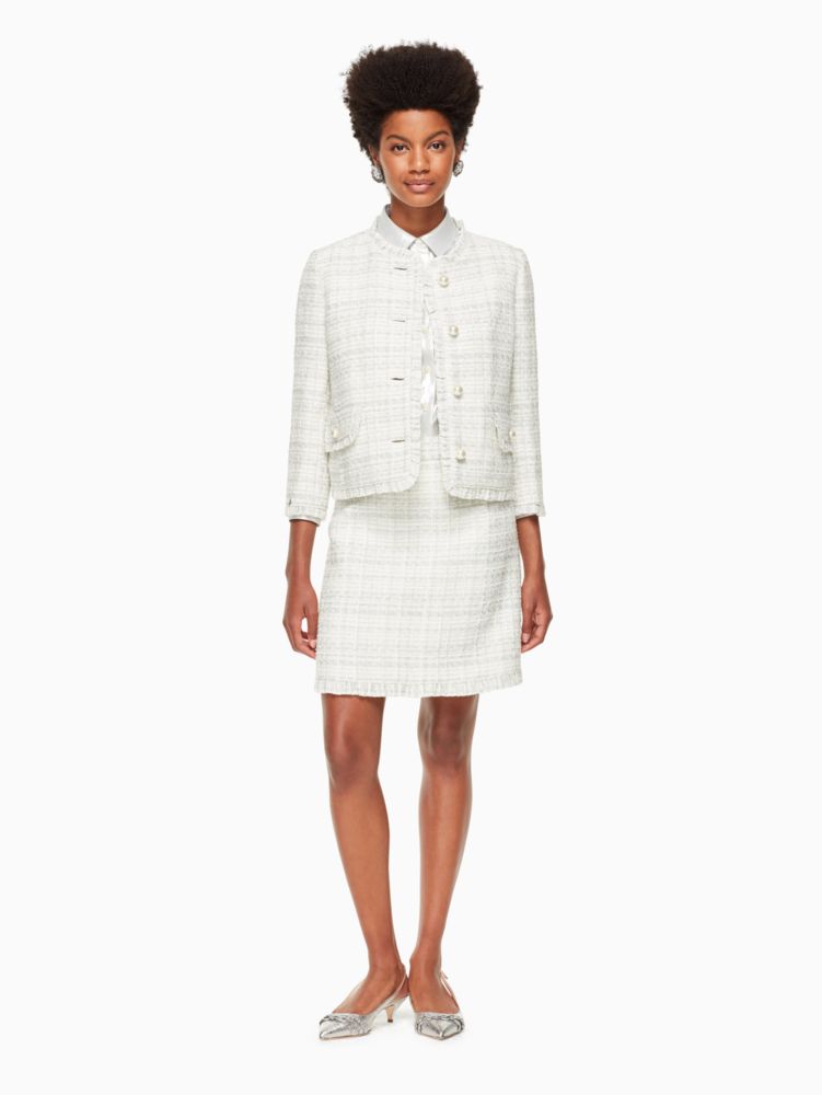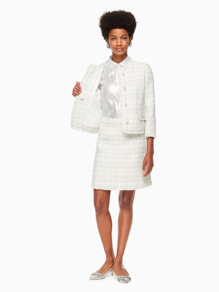 aren't you all buttoned up. this classic tweed jacket features flecks of metallic threads and oversized pearl buttons for a ladylike topper that adds some feminine polish to any outfit.