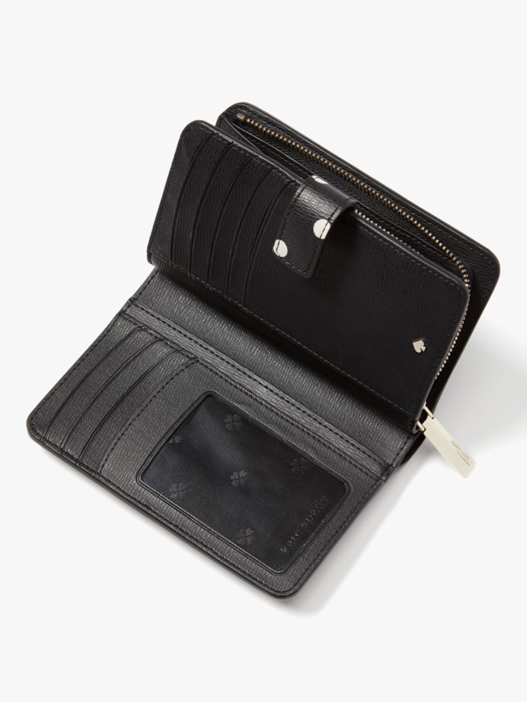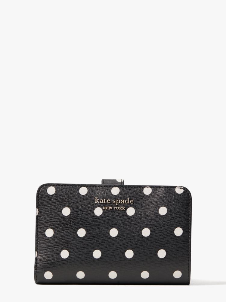 our spencer compact wallet gets a playful spin in durable faux leather printed with our classic cabana dots. of course, we made this style as functional as it is beautiful: unsnapping it reveals plenty of slots, slip pockets and zipper pockets for your current and growing card and receipt collection.