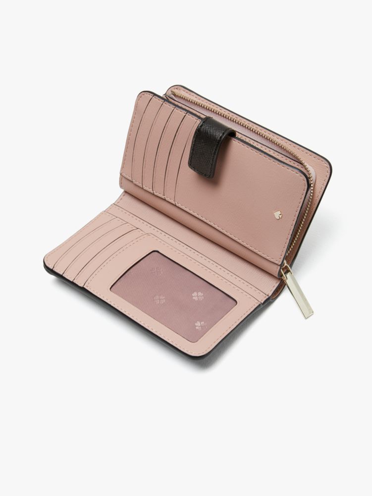 our spencer compact wallet is done in a new saffiano leather we introduced this summer. its soft texture is nice to touch and durable against drops and scratches so it'll keep its sleek, luxe look. of course, we made this wallet as functional as it is beautiful: unsnapping it reveals that the spade flower jacquard-lined interior is filled with plenty of slots, slip pockets and zipper pockets for your current and growing card and receipt collection.