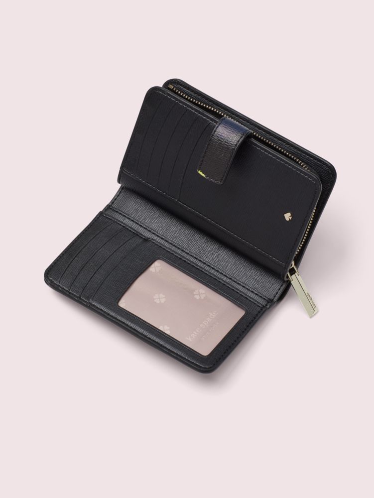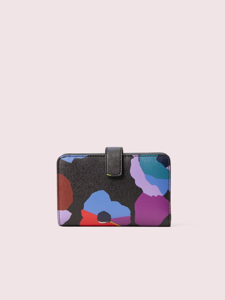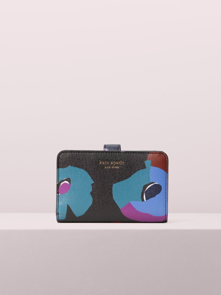 our spencer compact wallet gets a whimsical spin for fall in durable faux leather printed with our vibrant floral collage motif. of course, we made this wallet as functional as it is beautiful: unsnapping it reveals that the spade flower jacquard-lined interior is filled with plenty of slots, slip pockets and zipper pockets for your current and growing card and receipt collection.