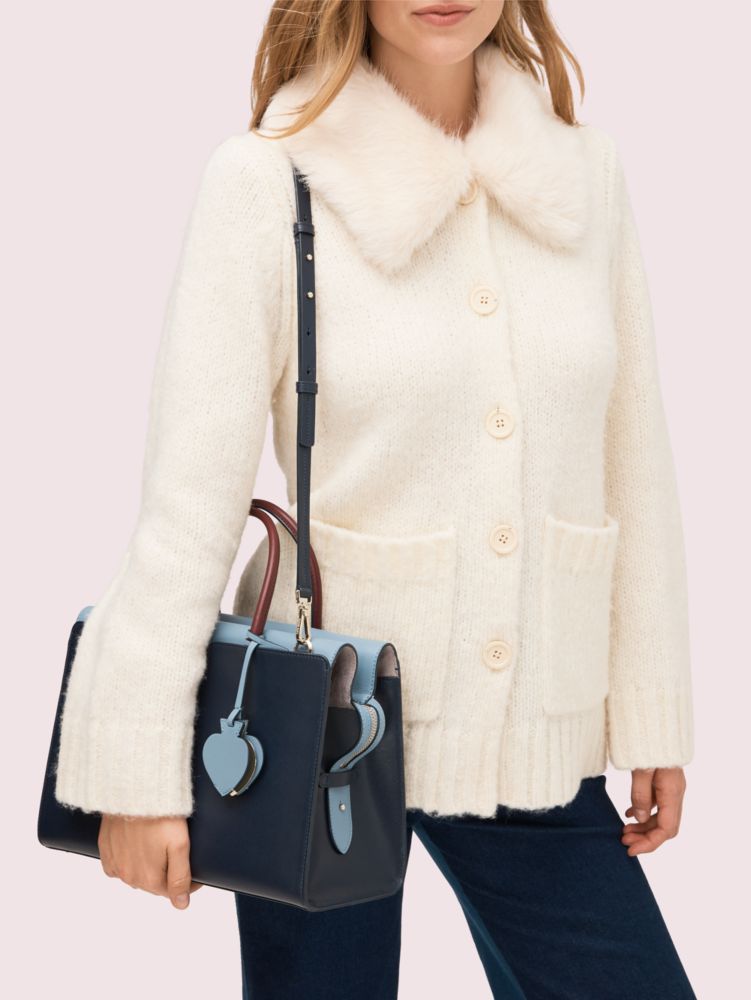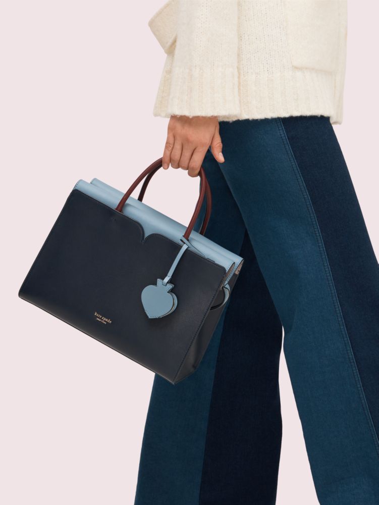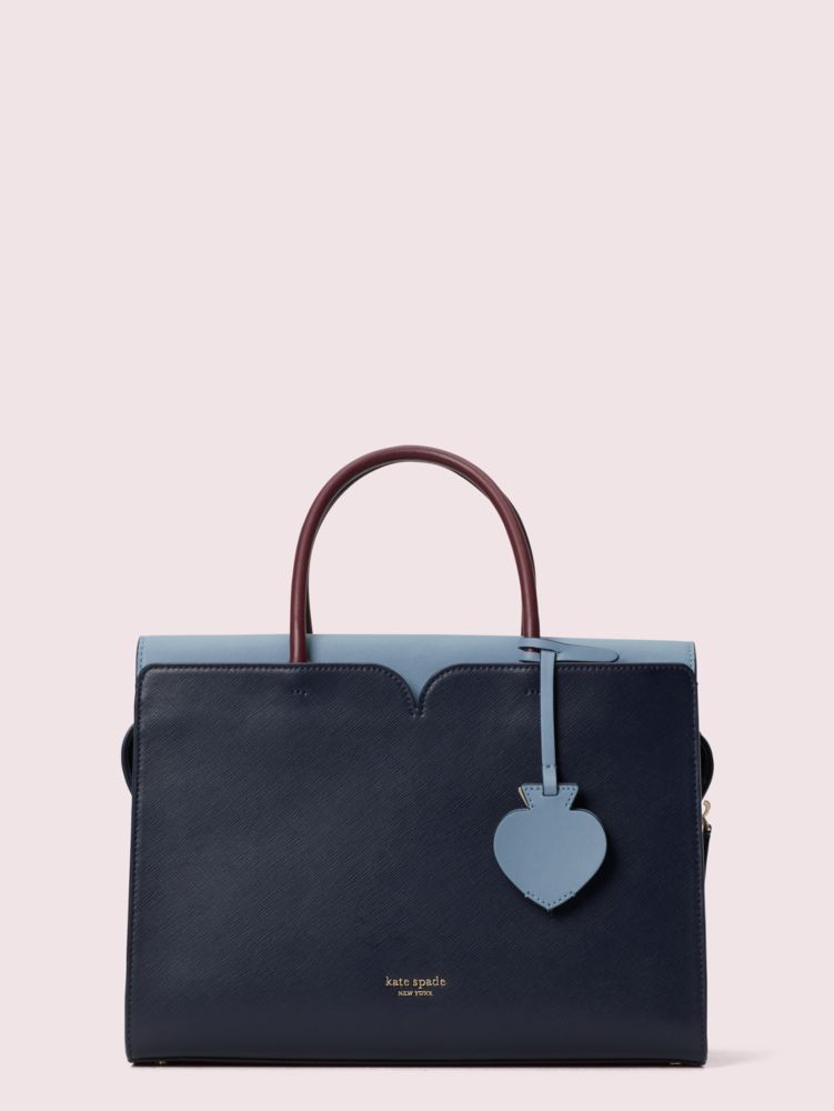 we love how soft and durable the saffiano leather is on our spencer wallets. so we used it to make this large satchel and trimmed it with smooth leather in contrasting colors to add to the luxe texture. of course, we made this style as functional as it is beautiful: unzipping it reveals multiple zipper and snap-tab slip pockets to organize all your things. (bye rummaging.) we finished it with secret details in unexpected places. see: the hidden back slip pocket for your phone or metrocard and the leather spade-shaped charm that reveals a mirror when you lift the front.