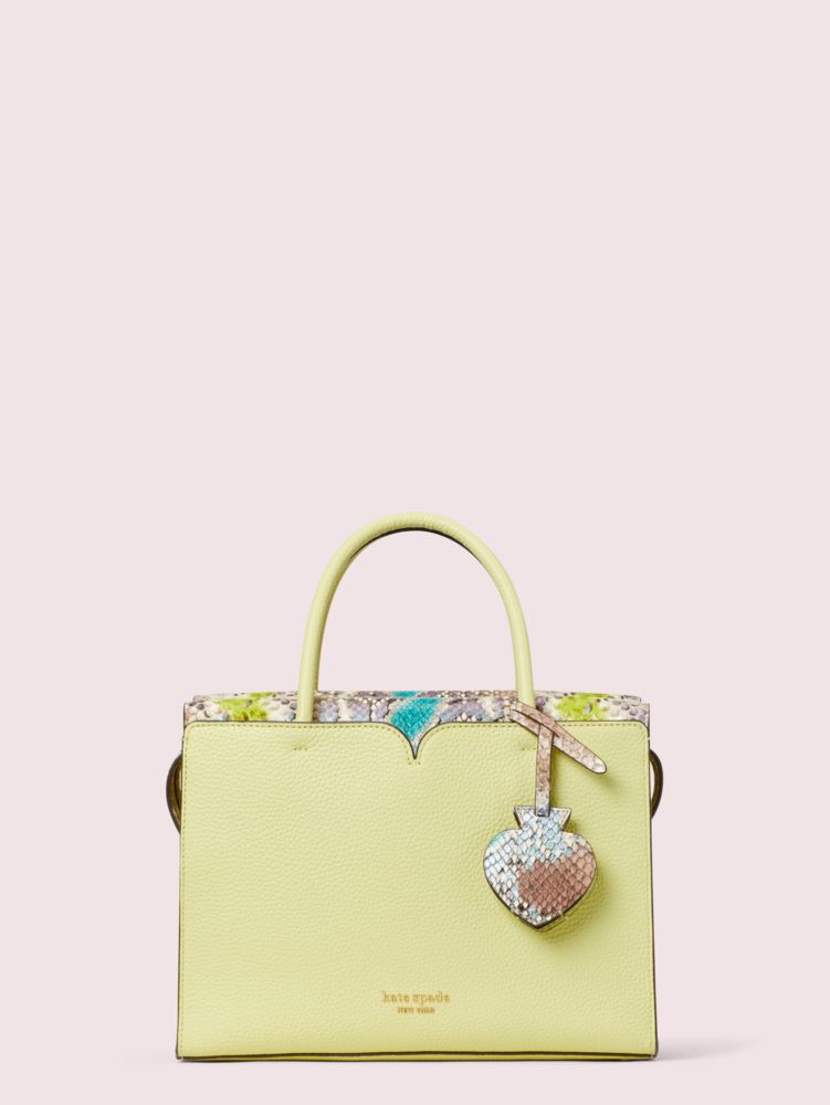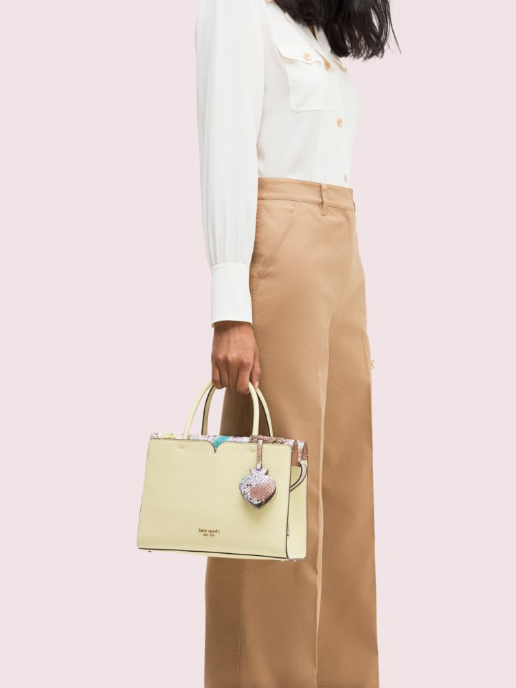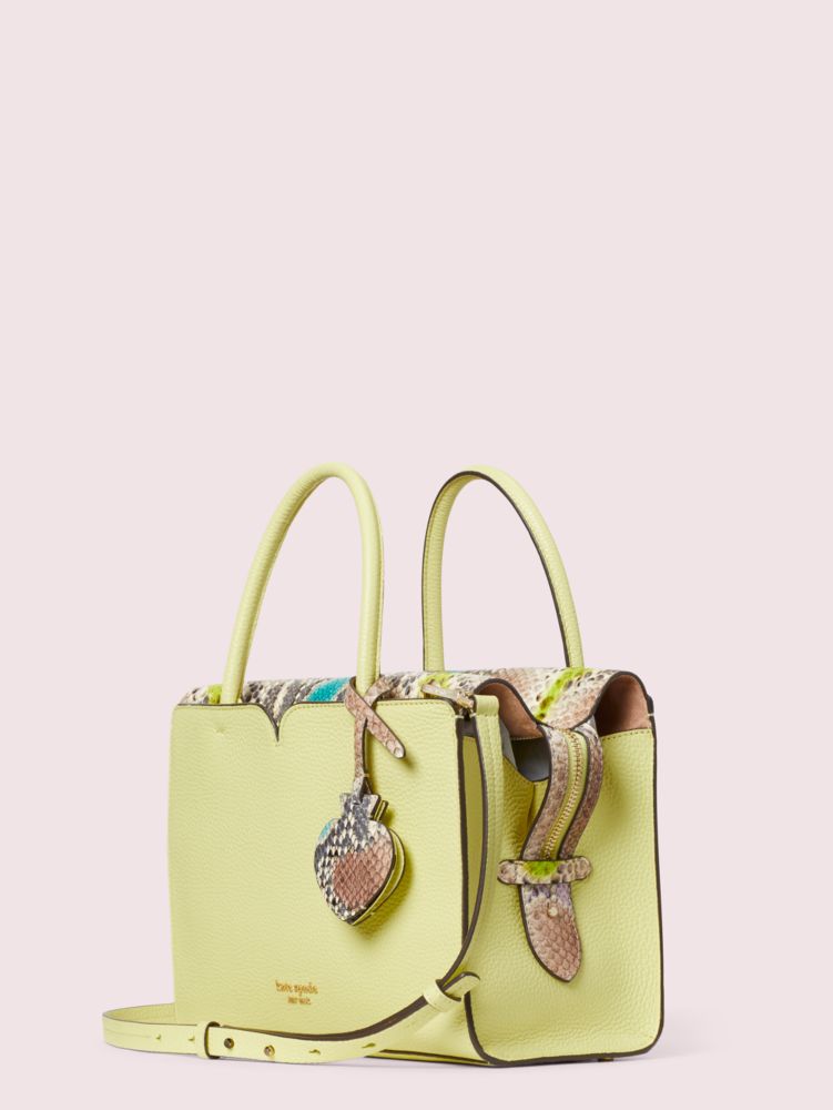 our spencer medium satchel gets a glam spin in durable pebbled leather punctuated with snake-embossed italian leather trim. we finished it with secret details in unexpected places. see: the hidden back slip pocket for your phone or metrocard and the leather spade-shaped charm that reveals a mirror when you lift the front.