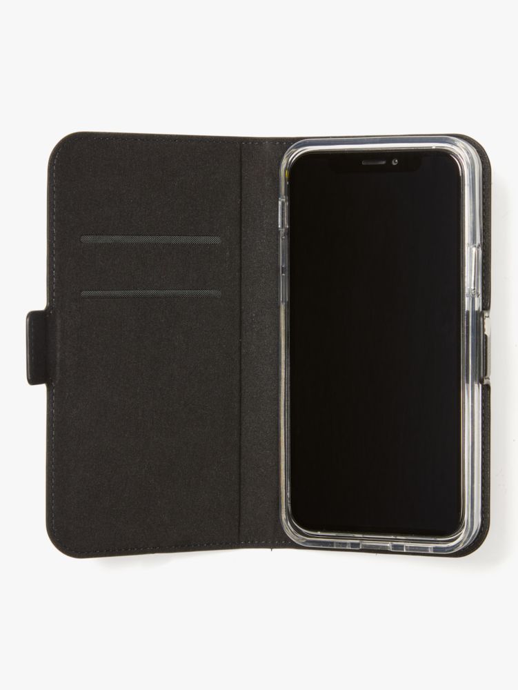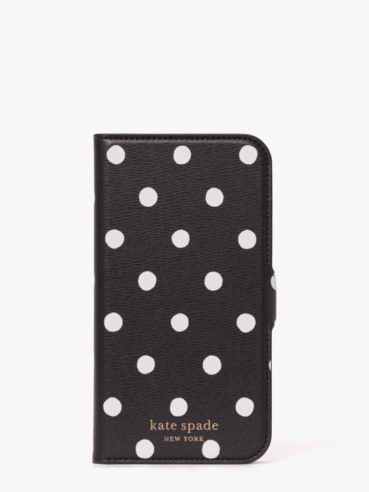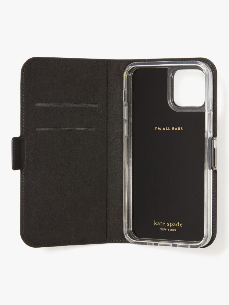 the genius thing about this spencer folio is that it keeps your phone protected and covers the screen to prevent scratches. also, the case secures to the folio with a magnet, so it's easy and fun to take on and off. we added pockets inside to carry essentials like your i.d., credit card and coffee cards.