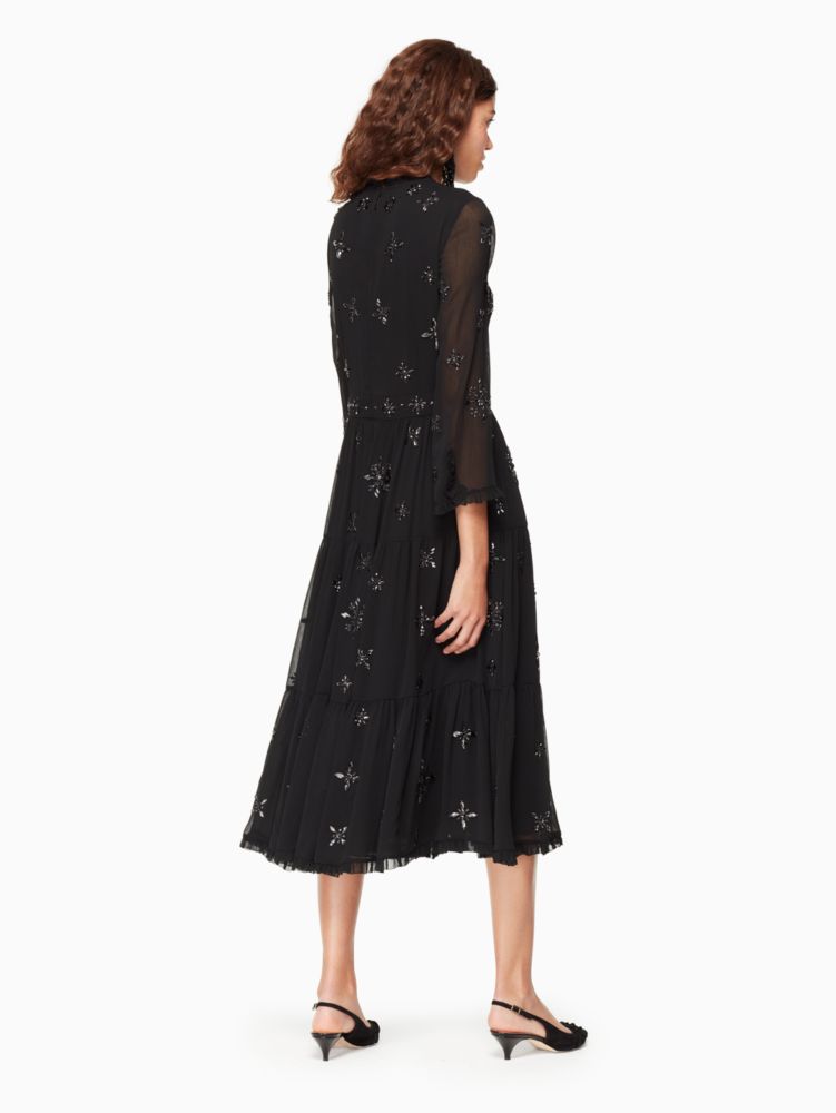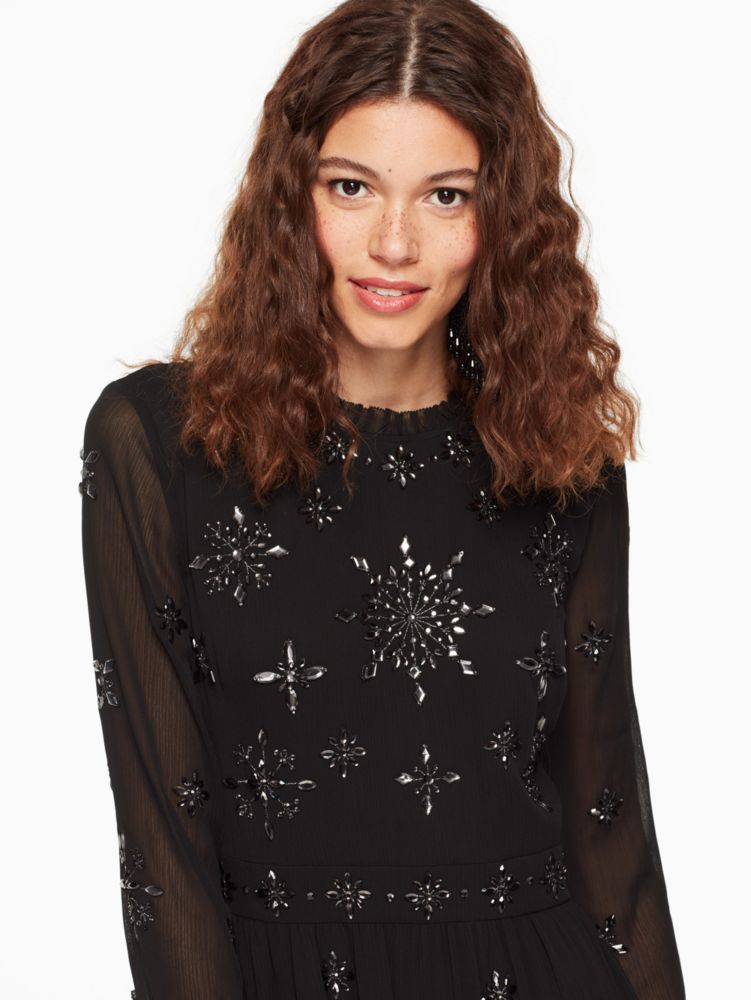 dazzle any room in this sheer chiffon dress, with delicate crystal details like the celestial night sky. with a just-right length, it perfectly pairs with opaque tights and a stunning topper on the coldest of days.
