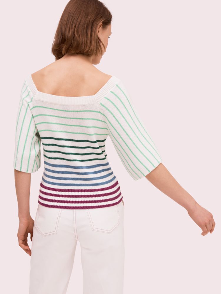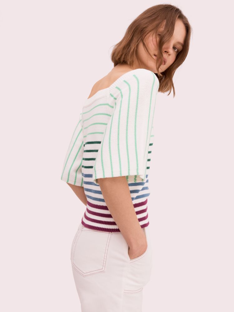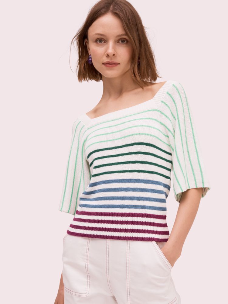 we think sweaters were destined for more than just the cold weather, so we designed this one especially for warmer days. white stockinette-stitched cotton give it its airy feel and the square neck, raglan sleeves and multicolored stripes give it a slight nautical vibe.