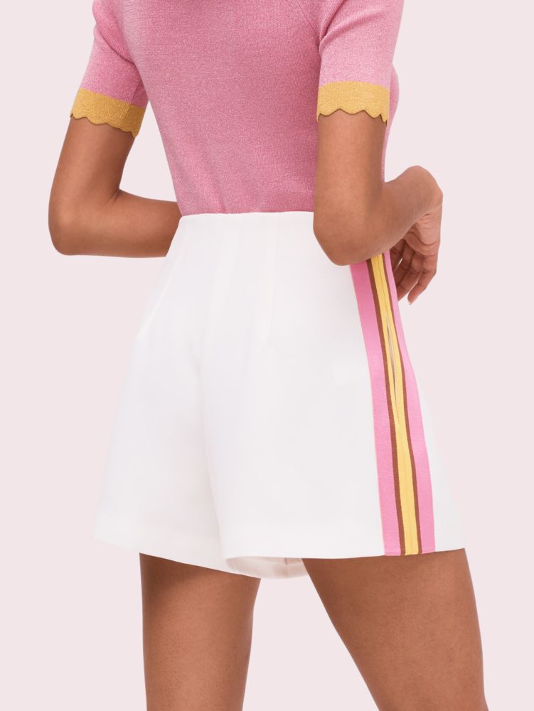 we took timeless menswear-inspired trouser shorts and added feminine details like drapey, white crepe fabric and pink and yellow satin stripes at the sides. also important: it features side-seam pockets for a place to hold your phone, or just to rest your hands. wear it with a blazer for a polished look or a graphic tee on the weekends.