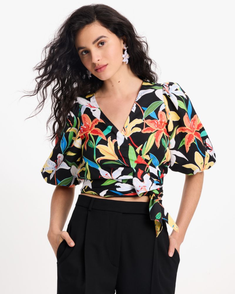 Florals aren't just for spring...this pretty wrap top, done in our Summer Lilies print twill, is proof.