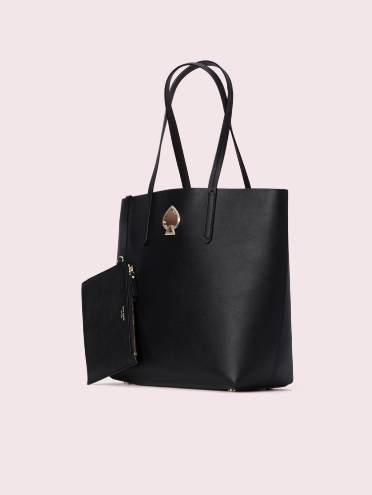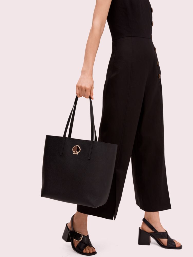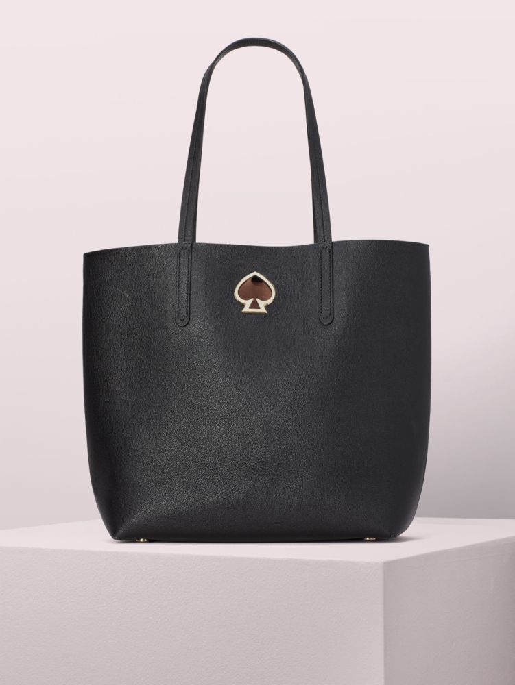 playful and effortlessly stylish, the suzy large north south tote is crafted of small pebble grain leather in the most gorgeous colors, and punctuated with our signature spade grommet. but there's more to her than just good looks. true to its name, the tall silhouette fits all the imporant things, and then some. the soft faux microsuede interior features a removable zipper pouch to keep your extra special items safe and easy to find. carry it on its own or wear it with your smaller crossbody for a cool, double bag moment.