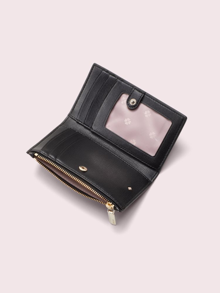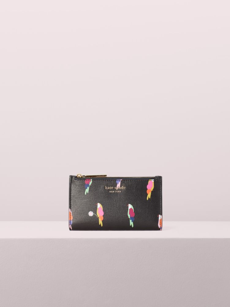 here's a classic bifold wallet to hold your cards, cash, change and love notes for years to come. don't let the slim profile fool you: lots of pockets inside give you plenty of space to organize. it's made from durable crossgrain leather in our playful flock party print to keep it in pristine condition, too.