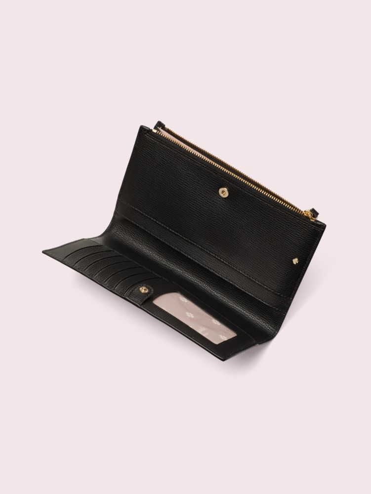 you can actually wear this wallet on your wrist. how convenient is that? it will hold your cards, cash, change and love notes for years to come. and don't let the slim profile fool you: lots of pockets inside give you plenty of space to organize. it's made from durable crossgrain leather to keep it in pristine condition, too.