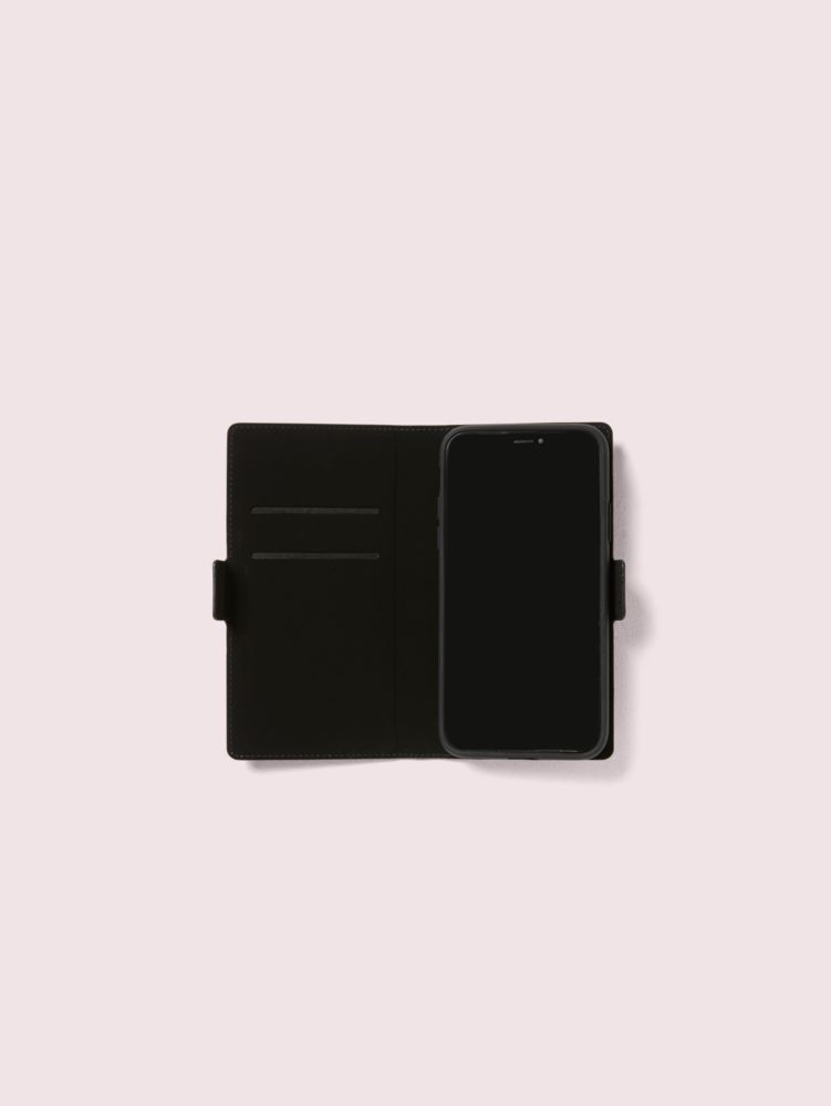 the genius thing about this folio is that it keeps your phone protected and covers the screen to prevent scratches. also, the case secures to the folio with a magnet so it's easy and fun to take on and off. we added pockets inside to carry essentials like your i.d., credit card and coffee cards. one final thought: the meadow-print faux leather leather feels very timeless.