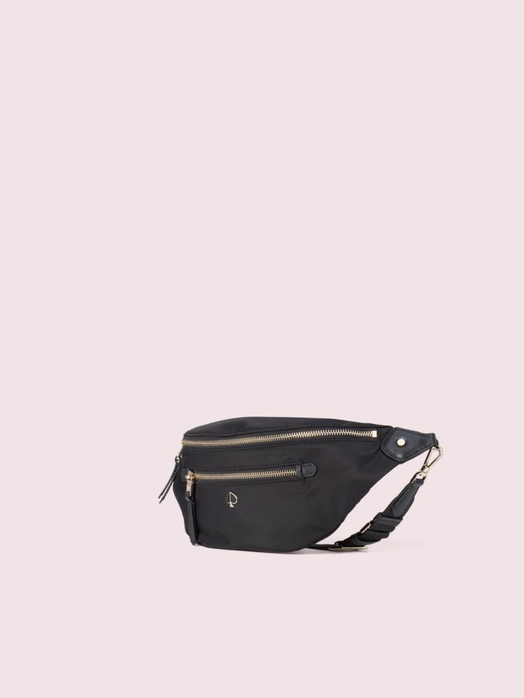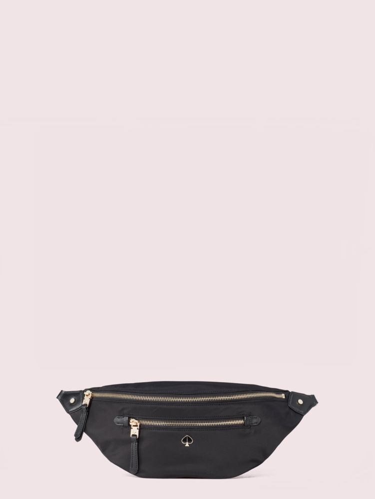 we've always loved the practicality of a nylon bag, and the taylor might be our most functional one to date. constructed of our classic durable woven nylon, this large belt bag features a surprisingly spacious interior with card slots, should you want to go wallet-free. a zip-around closure keeps all your important things safe, while the adjustable waist strap ensures the perfect fit. timeless details like matching leather trim and a shiny enamel spade come together to make it your go-to bag for years to come.