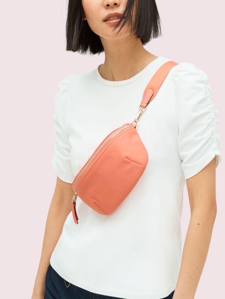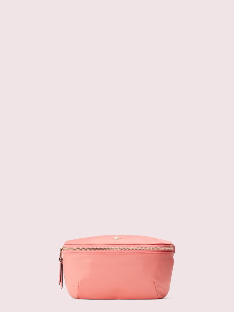 we've always loved the practicality of a nylon bag, and the taylor might be our most functional one to date. constructed of our classic durable woven nylon, this medium belt bag features a surprisingly spacious interior with card slots, should you want to go wallet-free. a zip-around closure keeps all your important things safe, while the adjustable waist strap ensures the perfect fit. timeless details like matching leather trim and a shiny enamel spade come together to make it your go-to bag for years to come.