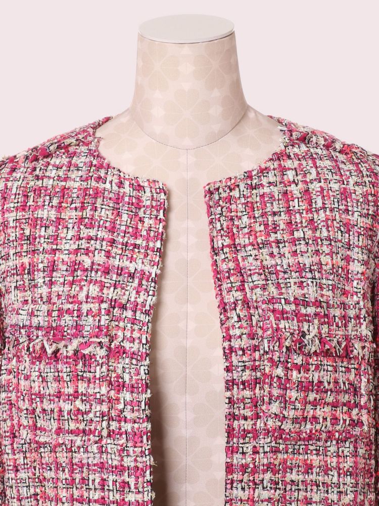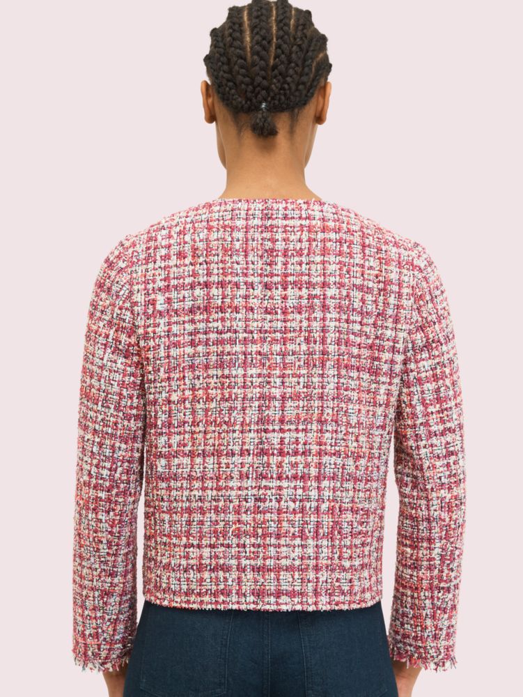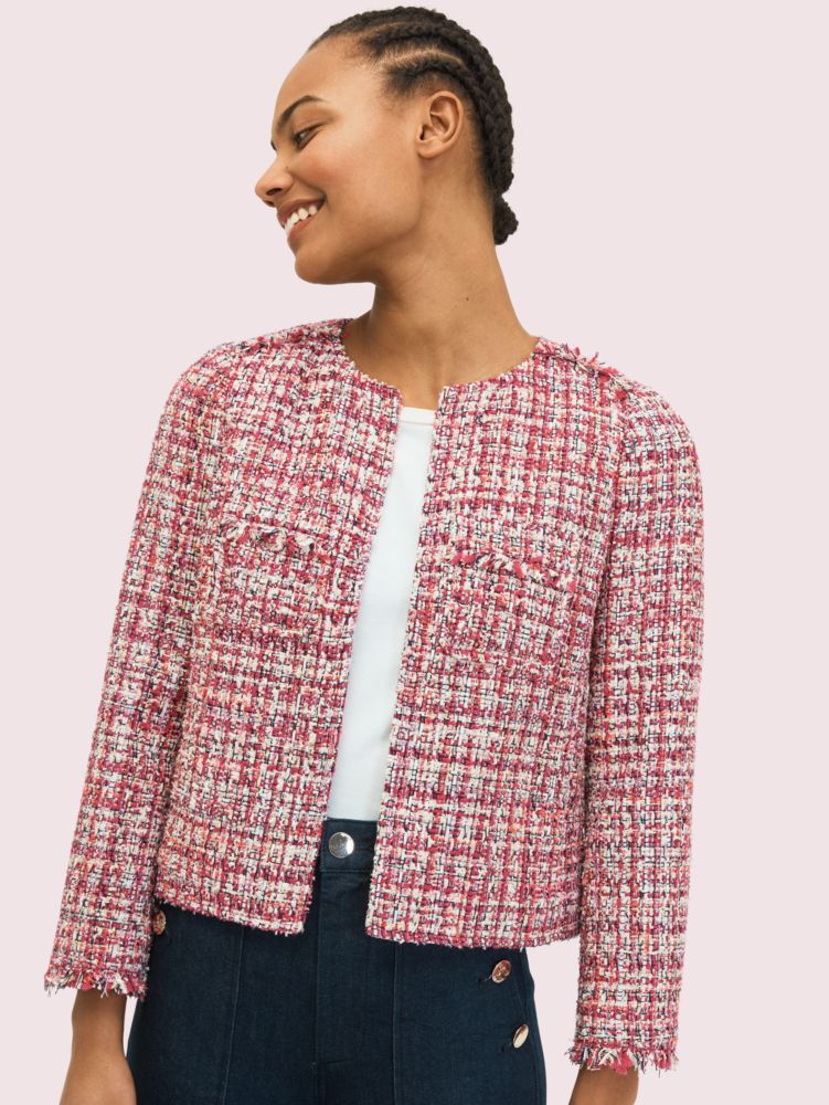 a classic tweed jacket reimagined in pops of pink and metallic gold thread. fringed edges and chest pockets will make this cropped style your go-to layer for dresses, blouses, tees...