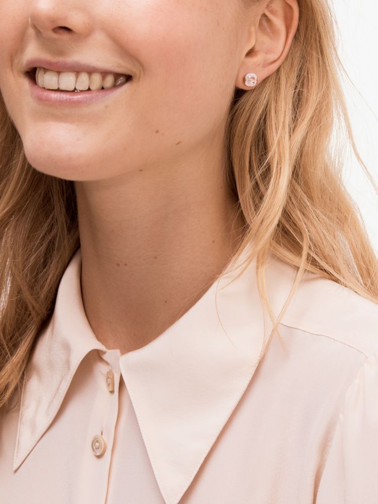 each piece in our that sparkle collection stays true to its name. we decked these princess cut studs out with bold faceted crystals that shine extra bright when they catch the light. but here's our favorite part. the back posts are tiny spades. sweep your hair up to show them off.