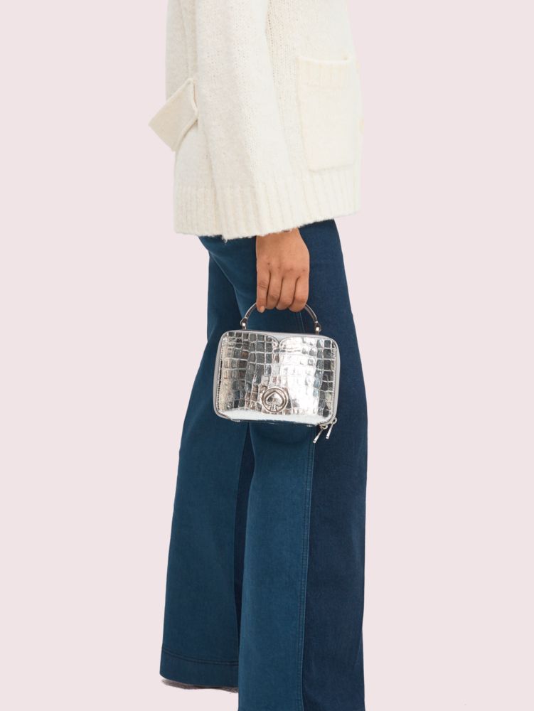 sporty meets feminine with our vanity mini top handle bag. reimagined in metallic croc-embossed italian leather for winter, the petite bag's boxy shape is a nod to the classic makeup case.
