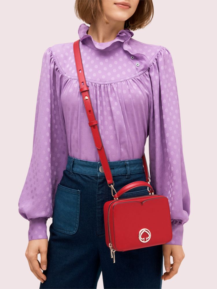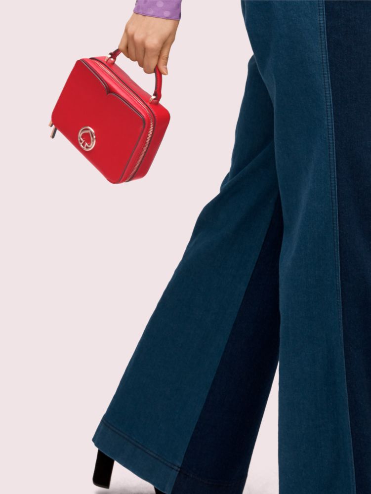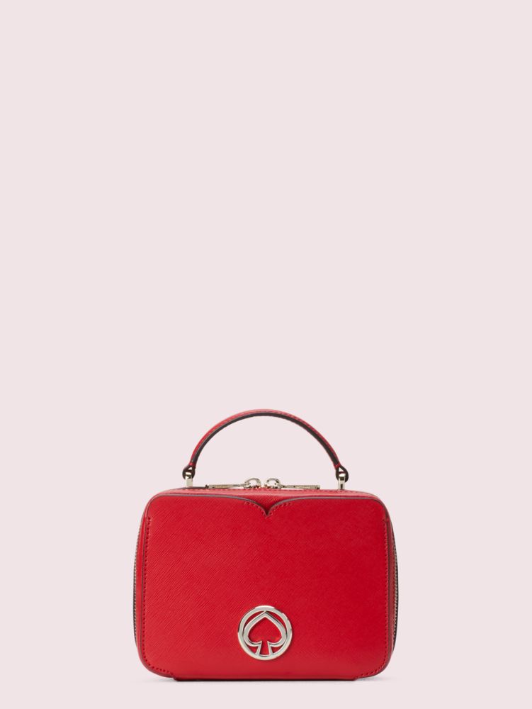 sporty meets feminine with our vanity mini top handle bag. crafted of soft (and durable) saffiano leather, the petite bag's boxy shape is a nod to the classic makeup case. when unzipped, its spade flower jacquard-lined interior offers enough room for your essentials with slots and pockets to organize it all. carry it by the handle or attach the adjustable strap to sling it across your body.