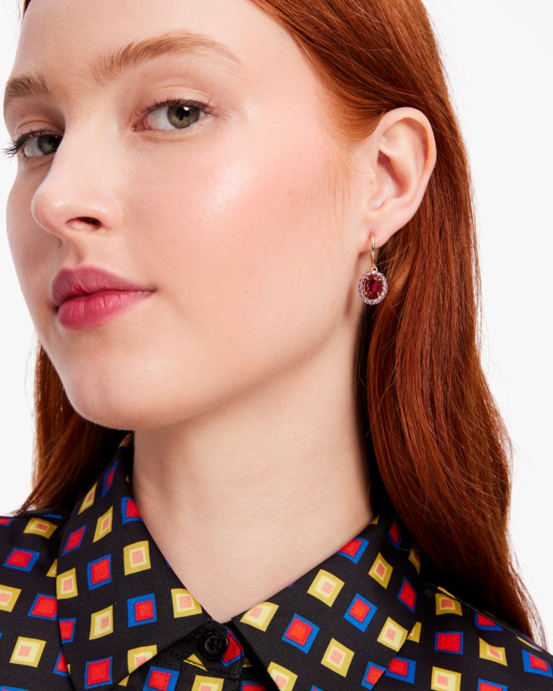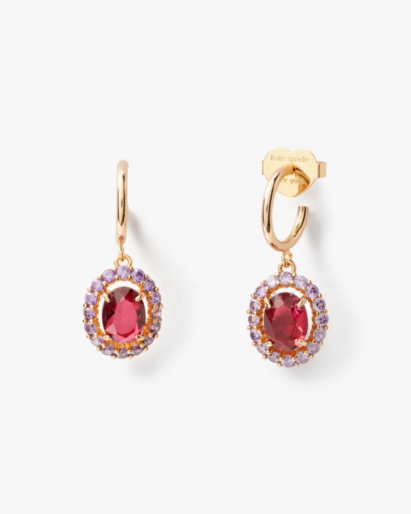 Jewelry fit for a queen. Our Victoria huggies showcase colorful oval-cut crystals with sparkling halo accents.