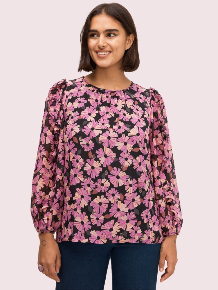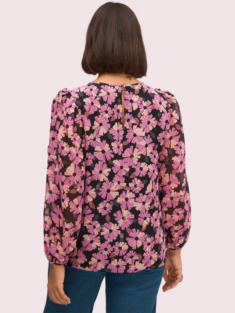 in our world, flowers are always in bloom. see: the graphic pink blossoms on this black chiffon blouse. look closely and you'll find we wove it with metallic pink fil coupé dots throughout. (in case it wasn't radiant enough.) we finished it with a gathered collar and semi-sheer ruffled sleeves to add to the femininity of this piece.