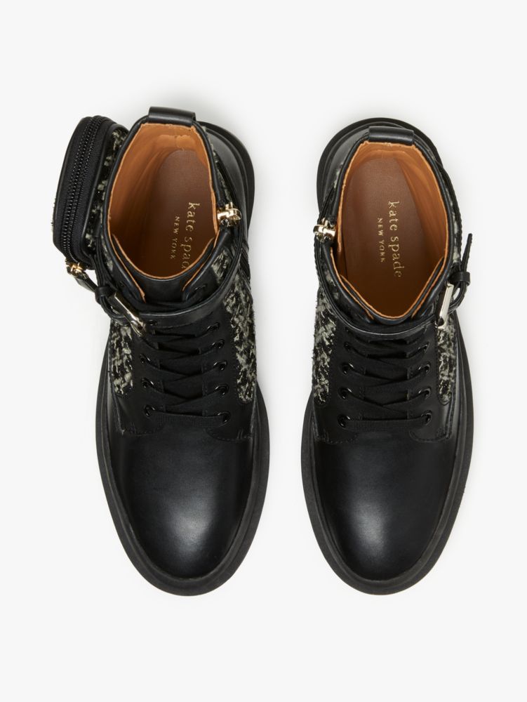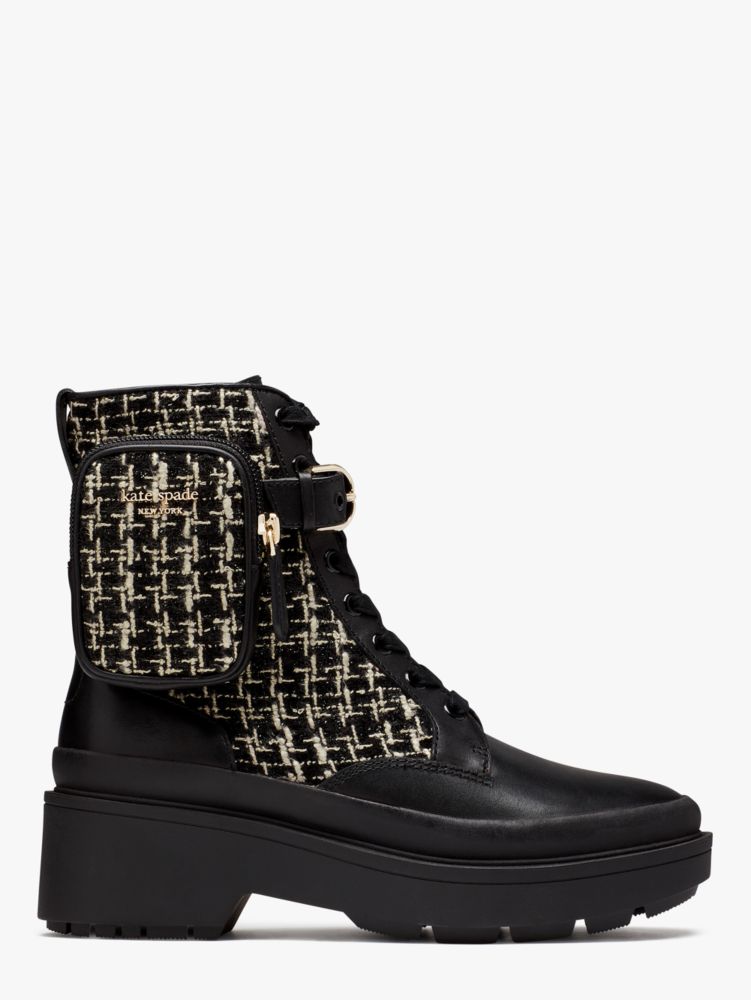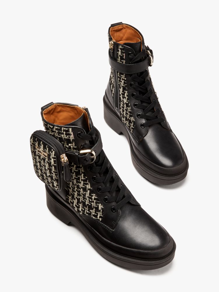 The classic combat boot, only more original: We added a zip pouch at the side of this leather and tweed pair for a clever way to stash the essentials. (Card, cash and red lipstick, of course...)